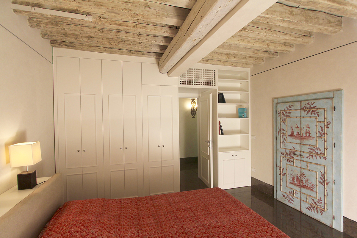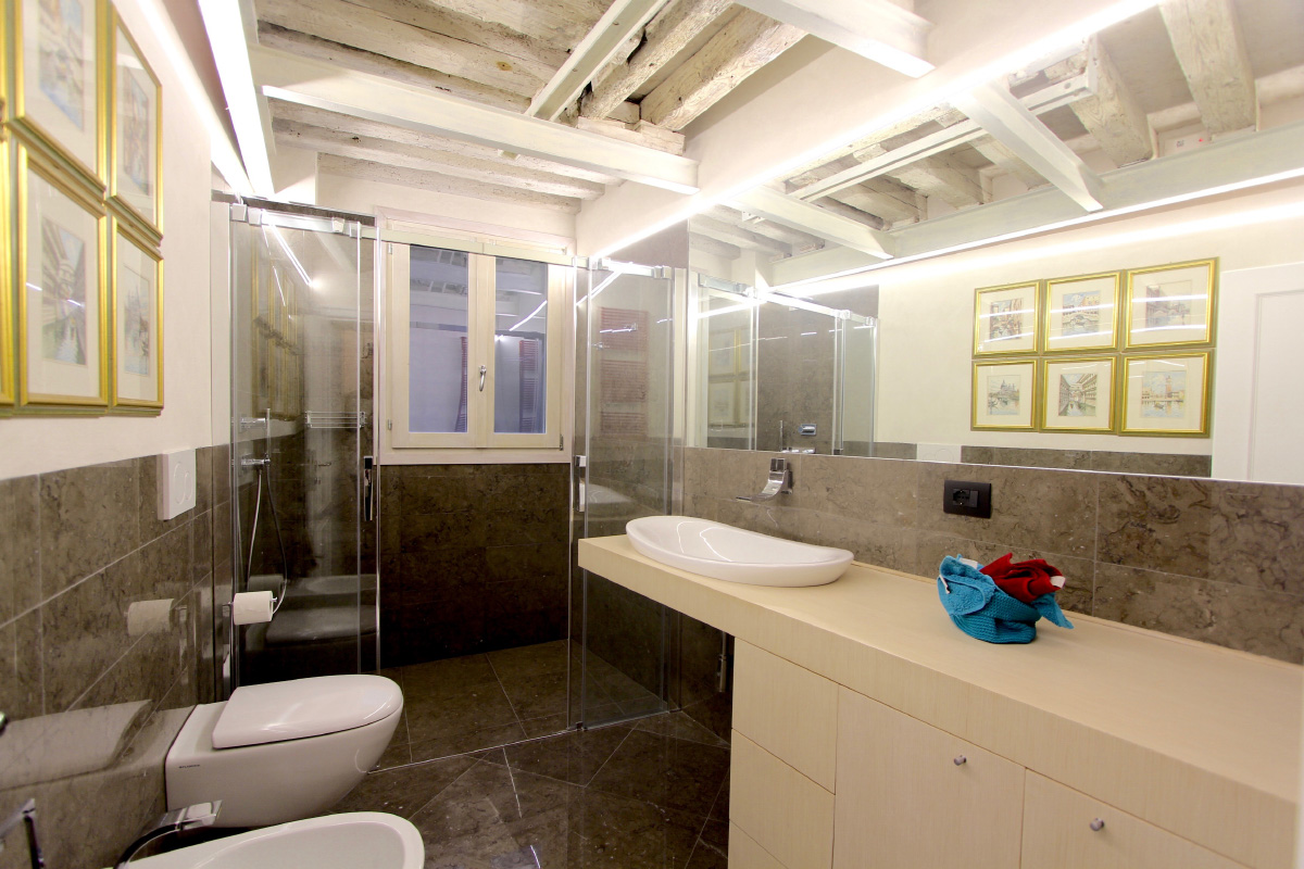 Posta in luce la struttura originaria si è deciso di risanarla e metterla in evidenza: sono così venuti allo scoperto i solai lignei, consolidamenti metallici, nicchie in muratura e pietra d’Istria, aperture nascoste … Le divisioni delle stanze, per migliorare la vivibilità degli spazi e per non creare ulteriori elementi fissi, sono stati realizzati esclusivamente con arredi progettati su misura, all’interno dei quali, inoltre, trovano spazio gli impianti ed anche gli elettrodomestici. Riportare la zona giorno nella sala centrale con le due grandi porte d’acqua (precedentamente erano state parzialmente chiude per far posto ai servizi igienici …) ha aumentato la luce e lo spazio che sembra prolungarsi sullo specchio d’acqua del Rio de la Toletta.