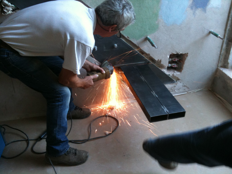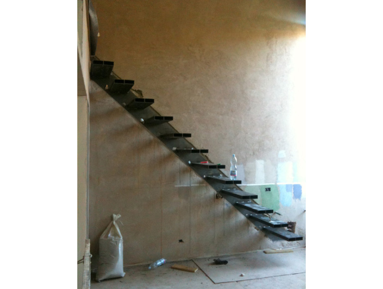 Questa è stata progettata a sbalzo: un largopiatto metallico infisso alla muratura, su questa saldati in opera dei doppi tubolari affiancati per creare la struttura principale.