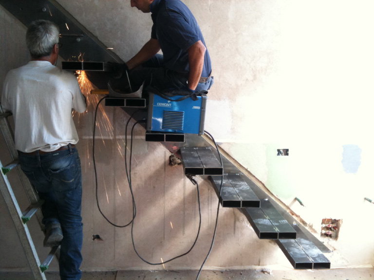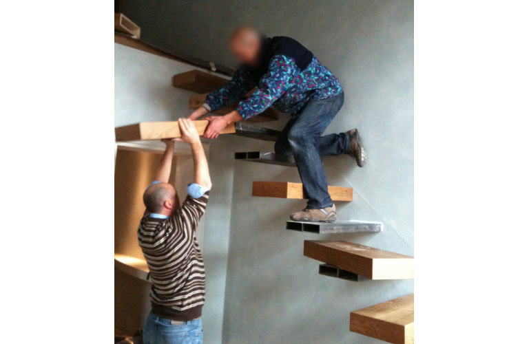 Per ogni scalino si è creata una scatola lignea di finitura: un’anima in compensato marino rivestita sui 5 lati con lo stesso parquet del pavimento. Ogni elemento, poi, è stato semplicemente infilato sui tubolari metallici.