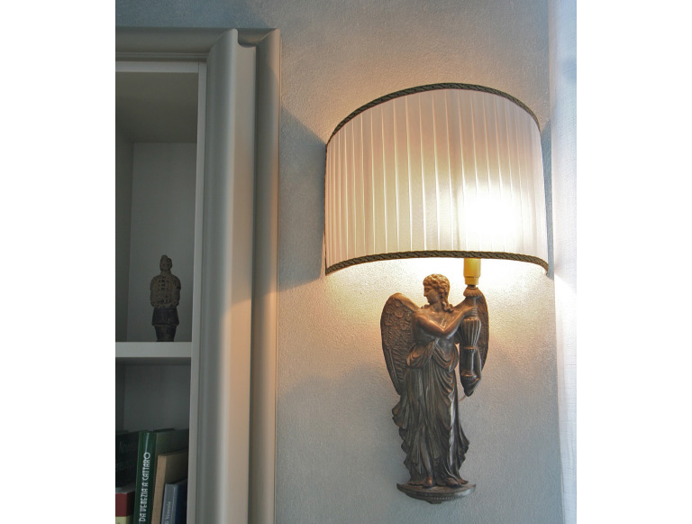 La libreria è incorniciata da un elemento ligneo sagomato e posto in “negativo” rispetto allo stesso che inquadra il blocco cottura. A lato completano la composizione due applique costituite da angeli in metallo ribattuto con paralume semicircolare.