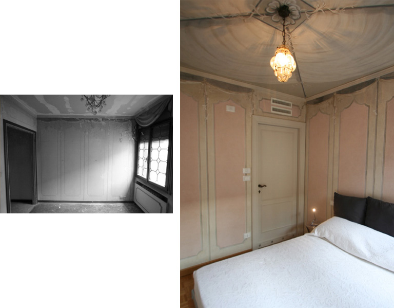 La camera, di modeste dimensioni, vede alle pareti un decoro a velario della fine degli anni ’40. L’incuria e i danni alla copertura avevano determinato uno stato di conservazione pessimo con perdita di gran parte dei pigmenti a parete e della totalità a soffitto. Il restauro ha visto il consolidamento di quanto ancora in essere senza alcuna integrazione. Il soffitto è stato rifatto con due semplici diagonali a formare un gazebo con tendaggi bianchi e elemento floreale al centro.