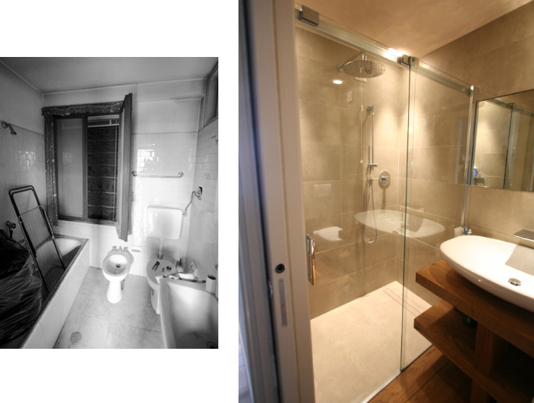 Il servizio igienico vede il piatto doccia a filo pavimento con piletta di scarico laterale: questo per eliminare i classici piatti in ceramica che creano uno scalino dividendo lo spazio.