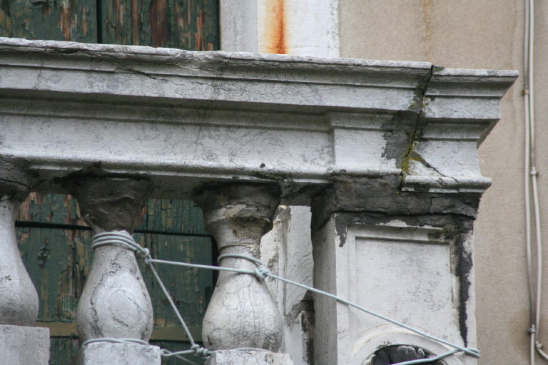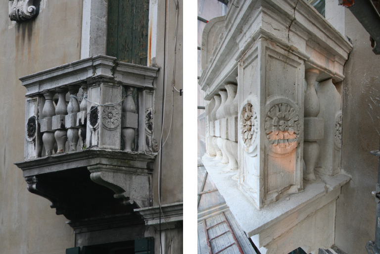 L’esterno è costituito da due poggioli in pietra d’Istria. Il loro stato di conservazione era pessimo con molti conci in procinto di crollo, tanto che alcune colonne erano malamente tenute assieme con un cavo televisivo.
