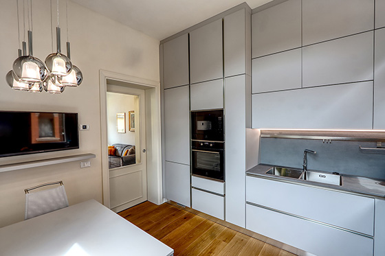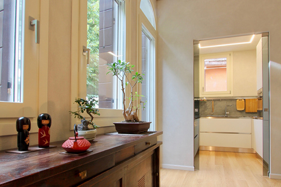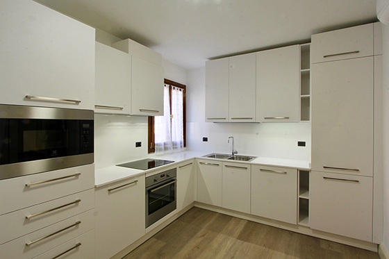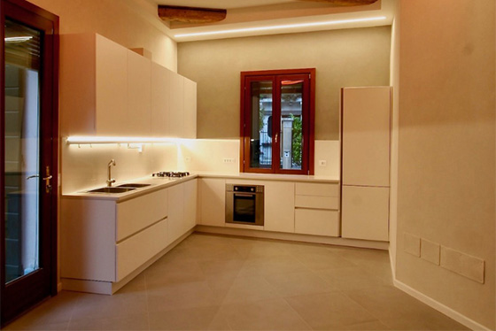 L’intendimento è stato quello di mettere in luce una struttura architettonica tipica di un palazzetto della venezia minore senza sconvolgere il suo assetto tipologico. Si è prediletto il gioco volumetrico per ampliare la sensazione spaziale e recuperare il vano sottotetto come zona abitabile. la scala, in legno e acciaio, funge da elemento di collegamento e determina una forte impronta d’arredo. per esaltare il connubio volumi - luce sono state usate finiture in velatura di calce pura in contrasto con il legno d’abete e l’acciaio.
