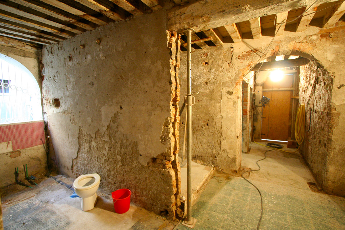 La proprietà precedente aveva cercato di trasformare un deposito commerciale in un appartamento. Di fatto si era fatta un’operazione di maquillage senza intervenire nella parte strutturale e funzionale di un’unità posta a piano terra nel centro storico di Venezia, direttamente confinante con un rio e con gli ovvi problemi derivanti dal fenomeno delle alte maree. Così si è predsposto un restauro integrale eliminando tutte le sovrastrutture, impianti e finiture che nei decenni si erano affastellati.