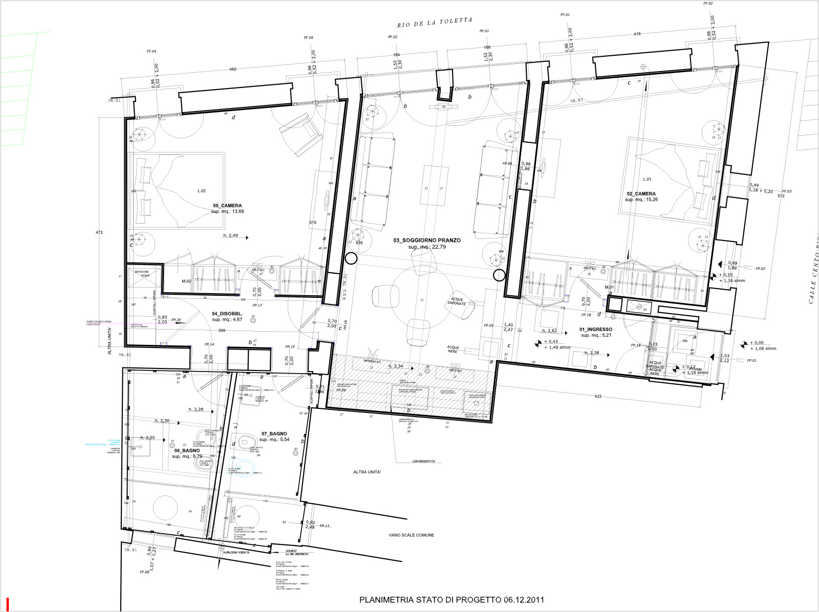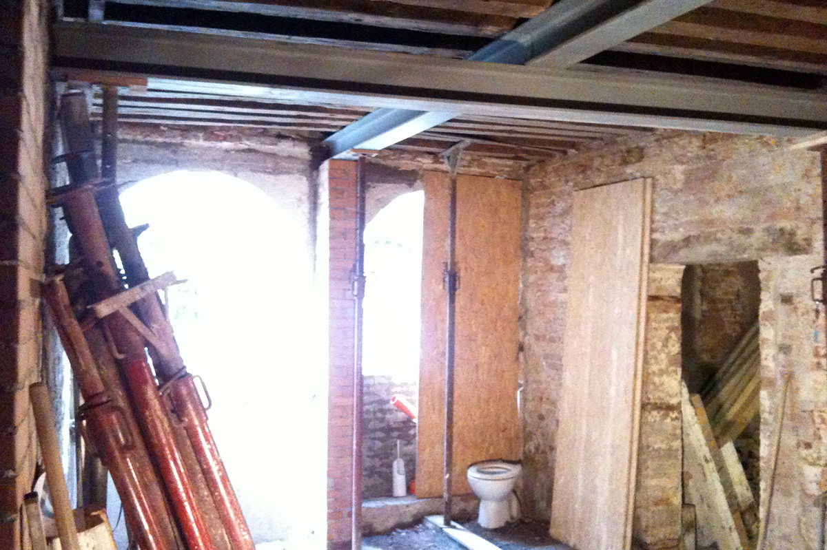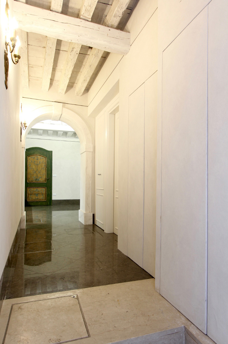 Posta in luce la struttura originaria si è deciso di risanarla e metterla in evidenza: sono così venuti allo scoperto i solai lignei, consolidamenti metallici, nicchie in muratura e pietra d’Istria, aperture nascoste … Le divisioni delle stanze, per migliorare la vivibilità degli spazi e per non creare ulteriori elementi fissi, sono stati realizzati esclusivamente con arredi progettati su misura, all’interno dei quali, inoltre, trovano spazio gli impianti ed anche gli elettrodomestici. Riportare la zona giorno nella sala centrale con le due grandi porte d’acqua (precedentamente erano state parzialmente chiude per far posto ai servizi igienici …) ha aumentato la luce e lo spazio che sembra prolungarsi sullo specchio d’acqua del Rio de la Toletta.
